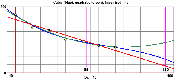 Bastano questi esempi per rendersi conto che è minimamente significativo ricorrere in casi come questo a strumenti matematici così raffinati: l'approssimazione mediante una regressione lineare o polinomiale di secondo o terzo grado, come evidenziato dai grafici, danno luogo ciascuna a valori molto diversi quando si esca dal range dei giorni per i quali si hanno i dati; per il 180° giorno si va da 80 a 370; ha senso solo stimare, con po' di buon senso, in circa 370 il numero dei prodotti vednuti l'85º giorno.