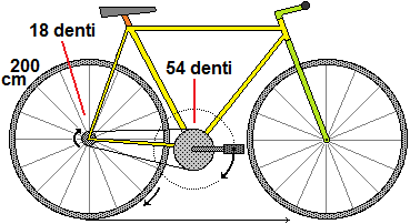 La circonferenza della ruota è di 200 cm. Luigi sta affrontando in bicicletta una leggera salita. Quanta strada percorre mentre compie un'intera pedalata, ossia quando un pedale compie un intero giro? 2) La biciletta di Sergio è dotata di cambio. Se Sergio operando sul cambio fa in modo che la catena passi dalla ruota dentata posteriore di 18 denti ad una di 22 denti, aumenta o diminuisce la strada che percorre in una pedalata? Perché? 3) Aumenta o diminuisce la forza che Sergio deve fare sui pedali? |