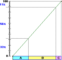 Dispongo della rappresentazione della distribuzione di un certo insieme di dati in tre categorie, A, B e C, mediante il diagramma a striscia sotto a sinistra.