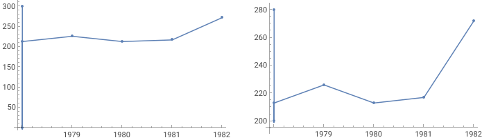 plot {(1978,300);(1978,0);(1978,213);(1979,226);(1980,213);(1981,217);(1982,272)}
