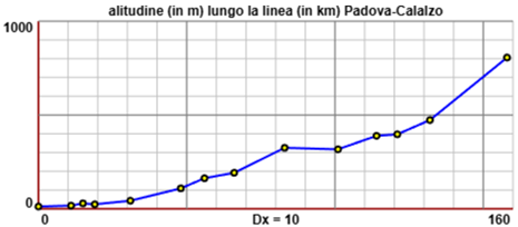 Padova-Calalzo, ricava (arrotondata alle decine di metri) l'altitudine (delle stazioni) di Montebelluna, Fener, Bribano, Polpet e Longarone.