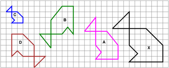Tra le riproduzioni A, B C e D della figura X alcune hanno la sua stessa forma (sono rimpicciolite, spostate ed eventualmente ruotate), altre no. Quali non hanno la stessa forma? Perché?