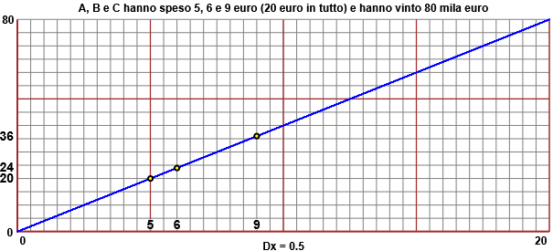 Il grafico rappresenta la relazione di proporzionalità che associa 80 mila a 20 (la vincita alla giocata). Le ordinate (le "y") che il grafico associa alle ascisse ("x") 5, 6 e 9 sono le vincite che spettano ai 3 giocatori: