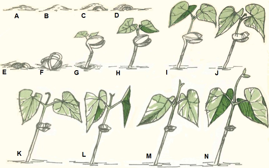 I semi a volte sono assi voluminosi, come le noci di cocco; altre volte sono piccolissimi, simili a polvere, come nelle bocche di leone. Consideriamo dei semi di dimensioni intermedie, ad esempio fagioli o chicchi grano, e studiamone lo sviluppo dopo averli posti in un recipiente su un po' di ovatta o di segtaura, che terremo costantemente bagnata. A fianco è illustrato lo sviluppo di un seme di fagiolo, in giorni successivi, A, B, ,N. Provate a studiare in modo analogo lo sviluppo di un seme di grano. Quale dei due semi si sviluppa più velocemente? Da dove viene il nutrimento che fa sviluppare le piante? Discutete, poi, con l'insegnante, come potreste studiare le dimensioni dei vari semi, ad esempio di fagiolo o di fava (come misurarle, come esaminare le differenze tra un seme e l'altro, ...). | ![]() |