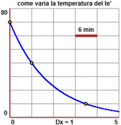Sia T la differenza (in gradi) della temperatura del tè dalla temperatura ambiente. Esprimiamo T in funzione del tempo, assumendo 6 minuti come unità per questo. Sappiamo che T(0) = 90-20 = 70 e che T(1) = 60-20 = 40. Dobbiamo trovare per quale t T(t) = 30-20 = 10. Schizziamo la situazione (qui il grafico è quello corretto, fatto col computer, come spiegato sotto, ma schizzando a mano il grafico otterremo qualcosa di simile); capiamo che ci vorranno in tutto 3 o 4 volte 6 minuti.