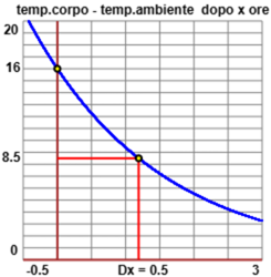 Indico con T la differenza tra la temperatura corporea e quella ambientale, di 21°, e con T(t) quella dopo t ore dalla morte. Il raffreddamento del corpo (fino alla temperatura ambientale) ha andamento approssimativamente esponenziale: T(t) = T(0)*a^t. Ipotizziamo che la temperatura da vivo fosse di 37°: