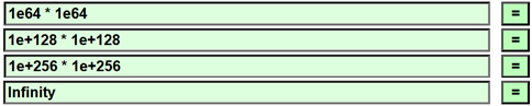 Il risultato di 1e256×1e256 sarebbe 1e512, ma è un numero troppo grande per il programma: la scritta Infinity (= infinito) esprime questo fatto.