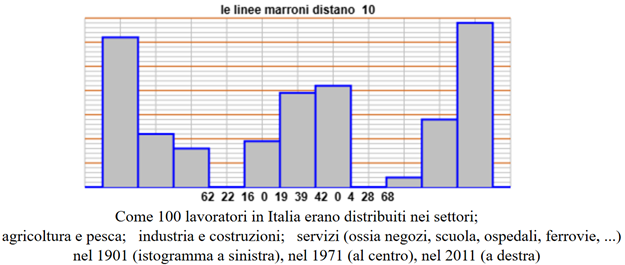 Ecco come mediamente 100 lavoratori in Italia erano distribuiti, in vari anni, nei settori agricoltura e pesca (A), industria e costruzioni (I), servizi, ossia negozi, scuola, ospedali, ferrovie, (S) e, nel 2011, in varie regioni. Rappresenta questi dati con degli istogrammi e descrivi a parole le differenze tra essi (clicca le immagini per ingrandirle).