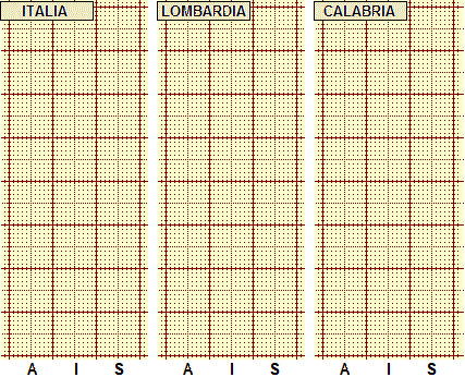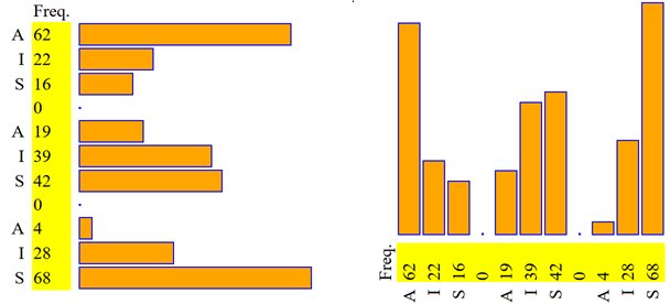 Introducendo A 62 | I 22 | S 16 | niente | A 19 | I 39 | S 42| niente | A 4 | I 28 | S 68 ottengo gli istogrammi a sinistra o (ruotando l'immagine) quelli a destra (si è messo a destra di HELP un numero più piccolo di 100 per ridurre le altezze delle colonne):