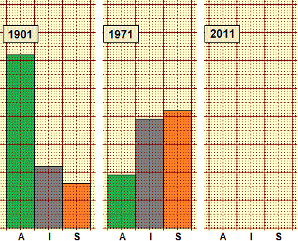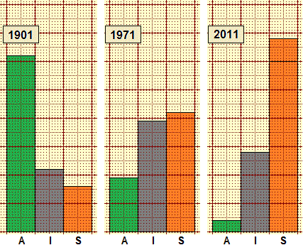 Italia 1901 Italia 1971 Italia 2011 A:62 I:22 S:16 A:19 I:39 S:42 A:4 I:28 S:68 Lombardia 2011 Calabria 2011 A:1 I:34 S:65 A:9 I:15 S:76