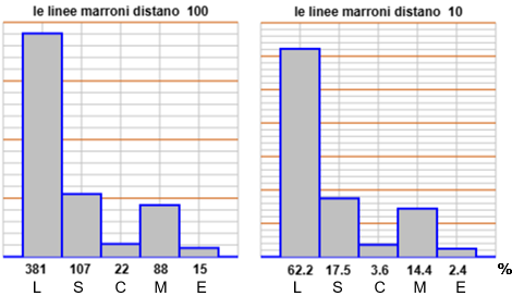 Una volta appreso il significato di "percentuale" si può anche costruire un grafico simile a quello soprastante a destra, che è stato realizzato con questo script. La distribuzione percentuale è realizzabile (o confrontabile con quella che è stata calcoltata) mediante lo script "distribuzioni %" presente qui che la fornisce con diverse approssimazioni.