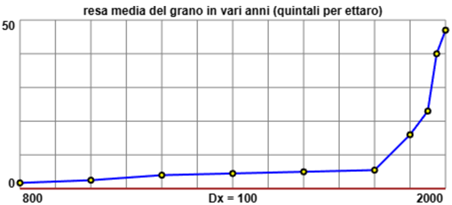 I dati seguenti riportano, approssimativamente, la resa media del grano in vari anni. I dati sono espressi in quintali per ettaro, ossia in quintali di grano che poteva annualmente produrre un ettaro di terreno (ricordiamo che 1 quintale = 100 kg e che 1 ettaro = 1 quadrato di lato 100 m). I dati sono i valori medi nelle zone più avanzate (esitono parti del mondo in cui la coltivazione del grano ha una produzione simile a quella che c'era in Europa 200 anni fa). I dati relativi ai secoli scorsi sono stime basate sui pochi dati a disposizione. Rappresenta graficamente i dati e prova a discutere che cosa è alla base del fenomeno descritto da essi.