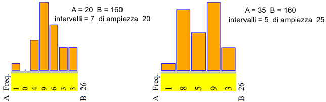 L'istogramma nel testo del quesito è ottenibile con: A = 20, B = 160, numero intervallini = 7. Quello richiesto con: A = 35, B = 160, numero intervallini = 5. Ecco gli istogrammi e le frequenze percentuali ottenute nei due casi.