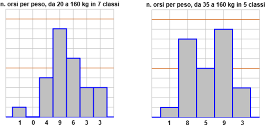 nelle Appalachian Mountains, catena montuosa del nord America: 110, 90, 60, 85, 95, 85, 115, 75, 140, 155, 120, 110, 90, 115, 75, 125, 80, 80, 80, 80, 110, 75, 120, 150, 38, 118 Quanti sono gli orsi su cui è stata condotta l'indagine? Quali sono i loro pesi medio e mediano? A destra è raffigurato un istogramma dei pesi rilevati. Traccia un istogramma con classi ampie 25 che parta da 35 ed arrivi a 160. Usa del software per i calcoli e per l'istogramma. |