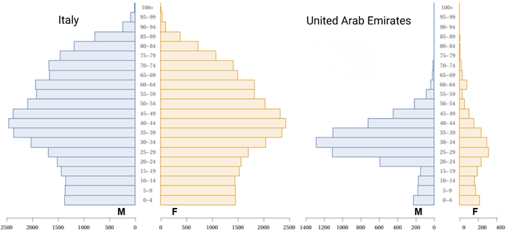 Ecco sotto come era distribuita la popolazione maschile e femminile in Italia e negli Emirati Arabi Uniti nel 2010. Sapete spiegare come mai ci sono queste grosse differenze? Discutetene tra di voi, consultando anche il libro di Geografia ed altre fonti di informazione.