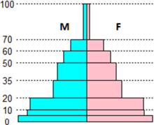 c'era una grande popolazione nei primi anni di vita, in gran parte dovuta al fatto che c'era un'alta mortalità infantile, oltre al fatto che si facevano più figli; poi si moriva mediamente molto prima di ora (a causa di malattie allora non curabili, a causa delle peggiori condizioni di vita di gran parte della popolazione, ...), per cui era piccola la parte della popolazione ultrasessantenne. La popolazione degli Emirati Arabi Uniti è composta per meno del 20% da "cittadini" degli E.A.U.: oltre l'80% sono persone che vivono e lavorano negli E.A.U. ma sono di altra nazionalità. Gran parte dei lavoratori sono maschi. Ciò spiega la grande maggioranza di abitanti di sesso maschile e la scarsa presenza di persone anziane. |