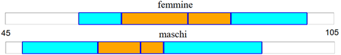 posso realizzarli con lo script "box-plot cl", che mi consente di rappresentare in una range [A,B] prefissato più boxplot di dati già classificati, in modo da poterli confrontare facilmente (scelgo A=45, B=105 in modo che A sia minore di tutti i dati di entrambe le sequanze e B sia maggiore di tutti).