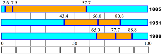 La successione dei tre box plot (meglio tracciati qui sotto) evidenzia come nell'arco di un secolo l'età di morte si sia progressivamente sempre più concentrata e attorno a una età sempre più avanzata: ad es. alla fine del XIX sec il 25% dei morti aveva età inferiore ai 3 anni e il 75% dei morti aveva età inferiore ai 58 anni; alla fine del secolo successivo il 75% dei morti aveva età superiore agli 88 anni.