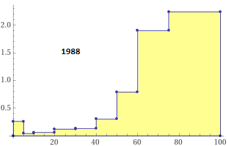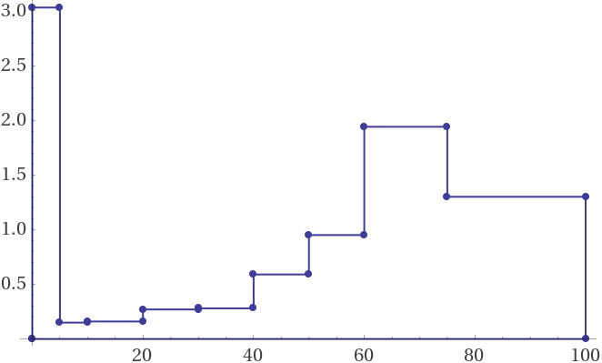 | plot (0;0),(0;3.03),(5;3.03),(5;.15),(10;.15),(10;.16),(20;.16),(20;.27),(30;.27),(30;.28),(40;.28),(40;.59), (50;.59),(50;.95), (60;.95),(60;1.94), (75;1.94),(75;1.3), (100;1.3),(100;0),(0;0) | |