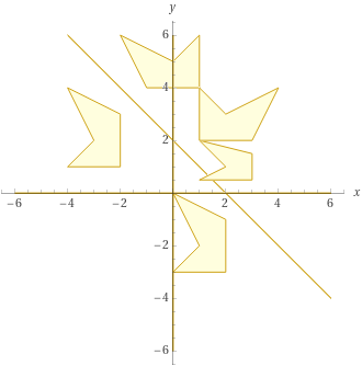 polygon (-6,0),(6,0),(0,0),(0,6),(0,-6),(0,0); polygon (-4,1),(-2,1),(-2,3),(-4,4),(-3,2); polygon (-4,6),(6,-4)![]() | |||