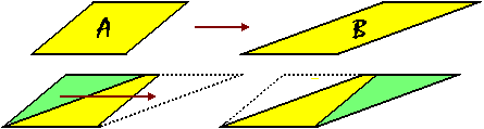 Si può dimostrare che paralleogrammi con uguale base e uguale altezza hanno uguale area anche in un altro modo. Consideriamo prima due paralleogrammi come i seguenti A e B: con la traslazione di un triangolo posso trasformazione A in B: le due figure sono composte dalle stesse parti, per cui, per la proprietà additiva, hanno la stessa area.