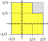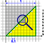 | Per determinare l'area del cerchio x2+ y2 = 1 (o meglio, x2+ y2 ≤ 1, dato che ci riferiamo anche ai punti interni) possiamo procedere sia direttamente approssimandola con unioni di quadretti, sia utilizzando opportunamente la proprietà additiva. Il primo metodo è illustrato nella figura a lato nel caso dei quadretti di lato 0.1 e per un quarto di cerchio; per gli altri tre quarti la situazione è analoga. Vi sono 67·4 = 268 quadretti contenuti, per cui 2.68 è una approssimazione per difetto; contando anche i quadretti a cavallo del bordo otteniamo 86·4 = 344 quadretti, per cui 3.44 è una approssimazione per eccesso. | ![]() | |