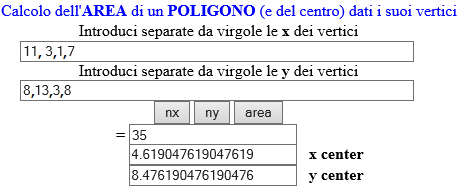 I calcoli sono fattibili facilmente con un programmino in JavaScript (vedi). Vediamo il caso del poligono precedente: