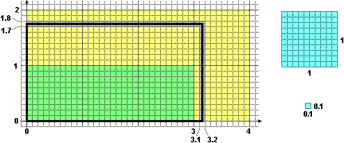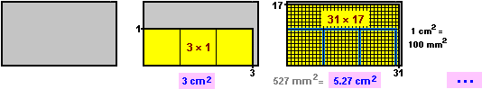 Ma posso inserirvi anche 31 per 17 quadrati di lato 1 mm, ossia prendere 527 mm2 come approssimazione per difetto dell'area del rettangolo considerato. Poiché in 1 cm2 contiene esattamente 100 mm2 e 527/100 = 5.27, posso esprimere questa misura anche come 5.27 cm2, valore che potevo ottenere direttamente moltiplicando le approssimazioni per difetto ai centimetri (3.1 e 1.7) dei lati del rettangolo.