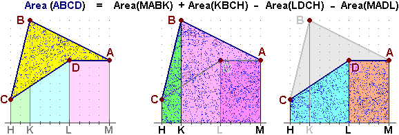 Ecco una generalizzazione: il calcolo dell'area di un poligono a partire dalle coordinate dei suoi vertici. Riferendomi alla figura seguente, penso il poligono come ABCD come la figura HMABC a cui venga sottratta la figura MADCH, figure entrambe pensabili come unioni di trapezi: