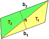 | Consideriamo un triangolo come composto da tante striscioline disposte parallelamente a uno dei tre lati, ad es. come se fosse realizzato con tante cannucce da bibita. Se facciamo scorrere le striscioline in modo che le loro estremità rimangano allineate, nel corso del movimento il triangolo cambia forma ma mantiene la stessa area (la somma delle aree di tutte le striscioline). Indichiamo con l la lunghezza del lato che rimane fisso e con h la distanza tra la retta a cui esso appartiene e il vertice opposto. Durante il movimento h non varia. | ![]() |