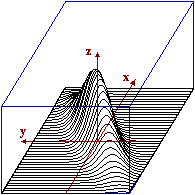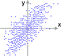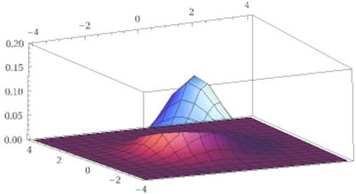 Altri due esempi. A destra è rappresentato un sistema (X,Y) con X e Y indipendenti. Comunque sezioni la superficie con piani paralleli ai piani xz e yz ottengo grafici con andamenti simili: hanno massimo e punto di flesso collocati nella stessa posizione. Potrebbe avere una forma simile (anche se non centrata in (0,0) e con diverse unità su gli assi) la distribuzione di (X,Y) con X e Y altezze di un uomo e una donna sorteggiati a caso. Invece, nel caso della superficie sotto a sinistra (per la quale a destra abbiamo tracciato un possibile grafico di dispersione sperimentale) siamo di fronte a X e Y non indipendenti; ad es., è evidente che le sezioni parallele al piano yz sono curve con il punto di massimo che man mano si sposta verso destra (avanza lungo la direzione dell'asse y). | ![]() |