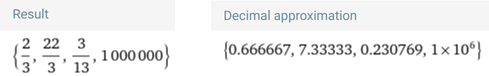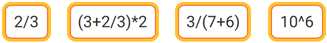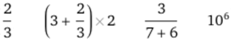 | 2/3 indica la divisione (o rapporto) tra 2 e 3, 3/(7+6) indica la divisione tra 3 e 7+6 dove 7+6 è stato racchiuso tra parentesi perché altrimenti 3/7+6 avrebbe indicato il termine rappresentato qui a destra, 10^6 indica 10 elevato alla 6 (in pratica "^" rappresenta una "freccia in su" che alza in alto il 6). | ![]() |
