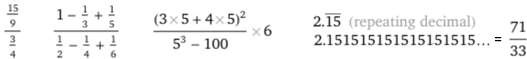 (15/9) / (3/4) (1 - 1/3 + 1/5) / (1/2 - 1/4 + 1/6) (3*5 + 4*5)^2 / (5^3-100)*6 2.151515...
