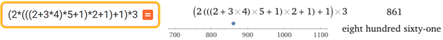 • (2·(((2+3·4)·5+1)·2+1)+1)·3 = (2·(((2+12)·5+1)·2+1)+1)·3 = (2·((14·5+1)·2+1)+1)·3 = (2·((70+1)·2+1)+1)·3 = (2·(71·2+1)+1)·3 = (2·(142+1)+1)·3 = (2·143+1)·3 = (286+1)·3 = 287·3 = 861