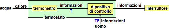 Sono informazioni di questo tipo la temperatura T fornita dal termometro e la temperatura TF fissata dall'utente in base alle quali il termostato decide quando accendere o spegnere la caldaia. | |