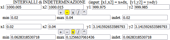 In realtà il fenomeno della "cancellazione delle cifre" (o, meglio, della perdita di cifre signficative) si verifica anche se i due numeri non hanno le stesse cifre iniziali, ma hanno comunque una differenza molto più piccola di loro, come nel caso di 999.98 e 1000 .01: se devo calcolare π(1000 .01-999.98) dove i due numeri sono valori approssimati, se con la CT ottengo 0 .09424778, è illusorio prendere 0 .094248 (arrotondamento a 5 cifre) come approssimazione del risultato in quanto il valore 0 .03 della differenza 1000 .01-999.98 ha 1 sola cifra significativa. Posso prendere solo 0 .09.