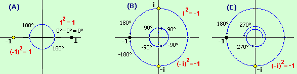 per un numero reale è interpretabile come una omotetia; proviamo a interpretare geometricamente la moltiplicazione per i: 1 per i sappiamo che fa i; quindi il "vettore 1" è stato ruotato di 90° -1 per i sappiamo che fa -i; quindi il "vettore -1" è stato ruotato di 90° Definiamo in modo analogo "i per i": i, ossia (0,1), ruotato di 90° diventa il vettore | ![]() |