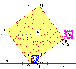 z → z + (4+3i), in quanto (x+iy)+(4+3i) = x+4+(y+3)i, trasforma ogni punto (x,y) in (x+4,y+3): è la traslazione di vettore (4,3) che trasforma il quadrato F nel quadrato F1; z → z · (4+3i) trasforma i punti del segmento OA nei punti del segmento OP; infatti O = 0+0i rimane invariato, A = 1+0i diventa 4+3i, ossia P; il punto medio di OA, ossia 0.5+0i, diventa 4/2+3/2i, cioè (4/2,3/2) che è il punto medio di OP, e così via. Facendo i calcoli in generale si ottiene: z · (4+3i) = (4x-3y) + (4y+3x)i; quindi B = (1,1) diventa Q = (1,7), C = (0,1) diventa R = (-3,4); è facile verificare che il poligono OPQR è un quadrato: è il quadrato F2 che si ottiene da F mediante la stessa rotazione attorno ad O e la stessa omotetia (trasformazione di scala monometrica) che trasformano il versore OA dell'asse reale (il numero 1) nel vettore OP (il numero 4+3i). | ||