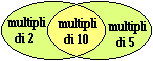 | i cosiddetti diagrammi di (Eulero-)Venn (usati per primo, probabilmente, da Eulero, nel XVIII sec., e diffusi da Venn, nel XIX sec.): nell'esempio a fianco i multipli di 2 e di 5 sono rappresentati dai punti di due figure ovali; i punti comuni alle due figure rappresentano i multipli sia di 2 che di 5; il diagramma viene usato per evidenziare che i multipli di 2 e di 5 sono i multipli di 10. [qualche altro esempio d'uso: numeri, figure(2), dipendenza e indipendenza]