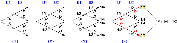 posso (1) rappresentare con successive diramazioni i diversi esiti possibili ("pari" e "dispari") per U1 e per U2, poi