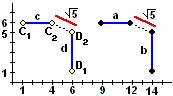 Un altro esempio. Nell'illustrazione a lato i segmenti a e b quanto distano? Anche in questo caso possiamo considerare la distanza tra i punti dei due segmenti che sono tra loro più vicini, ossia l'estremo destro di a, il punto (12,6), e l'estremo in alto di b, il punto (14,5). Si ottiene L'idea è, quindi, quella di prendere come distanza tra due figure la minima tra le distanze tra i punti dell'una e i punti dell'altra. |