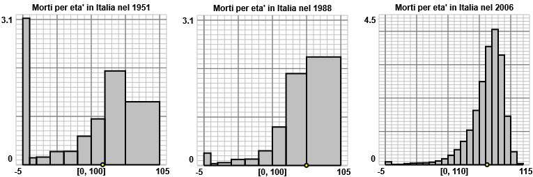 | distribuzione dell'età dei morti in Italia nel 1951 [dati in migliaia] | 0-4 | 5-9 | 10-19 | 20-29 | 30-39 | 40-49 | 50-59 | 60-74 | 75-100 |