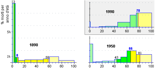 Le rispettive medie sono 28, 58 e 75: un morto nel 1890 aveva mediamente 28 anni, 58 nel 1950 e 75 nel 1990.