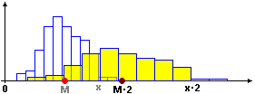 E M(kX) = M(X)·k: se sostituisco ogni dato x con kx anche la media si moltiplica per k (ad es., se dilato l'istogramma raddoppiando le ascisse e dimezzando le ordinate: l'area deve rimanere = 100% = 1 anche l'ascissa del baricentro raddoppia - clicca l'immagine per ingrandirla).