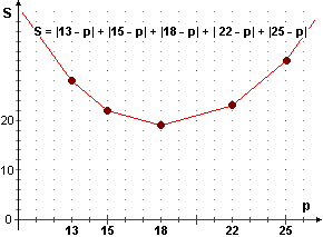 13, 15, 18, 22, 25, riferito alla mediana (= 18).