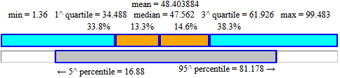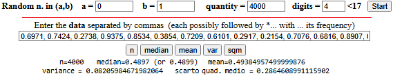 | A=0, B=100, 10 intervalli ampi 10 min=1.36, max=99.483, media = 48.403884 mediana=47.562, 1^|3^ quarto = 34.488|61.926 |