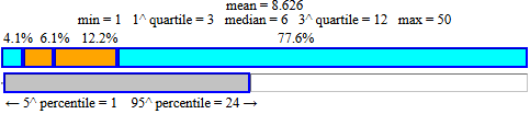 A=0, B=55, 11 intervalli ampi 5 min=1, max=50, media=8.626 mediana=6, 1^|3^ quarto = 3|12 |