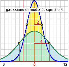 A destra sono rappresentate la distribuzione gaussiana di media 3 e sqm 2 e quella di sqm 4. Sono rappresentate dalla formula seguente, in cui "s" rappresenta lo sqm (o deviazione standard):