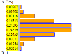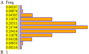 ![]() | A = 0 B = 1 10 intervalli di ampiezza 0.1 n = 1500 min = 0.0021983563208802 max = 0.9976128764578782 media = 0.489953283095 Anche in questo caso le colonne tendono ad avere la stessa lunghezza. [vedi qui per più dati con meno cifre] | |