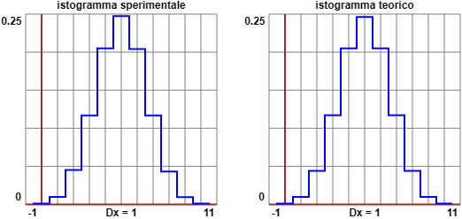 ![]() | i dati: 0*0.00107, 1*0.00974, 2*0.04505, 3*0.11674, 4*0.20511, 5*0.24744, 6*0.20414, 7*0.11678, 8*0.04326, 9*0.00953, 10*0.00114 A = -0.5 B = 10.5 11 intervalli media = 4.99325 |